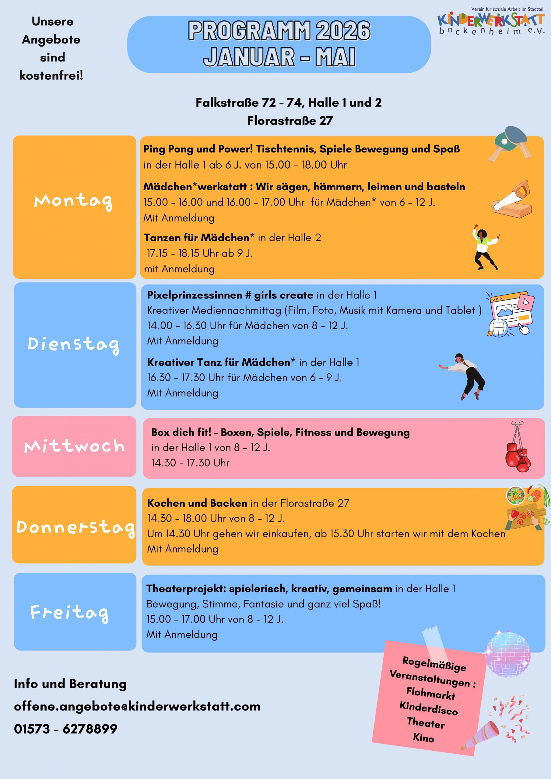 Das Angebot richtet sich an Kinder im Alter von 6-12 Jahren und an Jugendliche bis 15 Jahren und ist in der Regel kostenfrei. Es gibt Angebote speziell nur für Mädchen wie z.B. die Mädchenwerkstatt oder nur für Jungen. Für manche Kurse ist eine Anmeldung notwendig.
